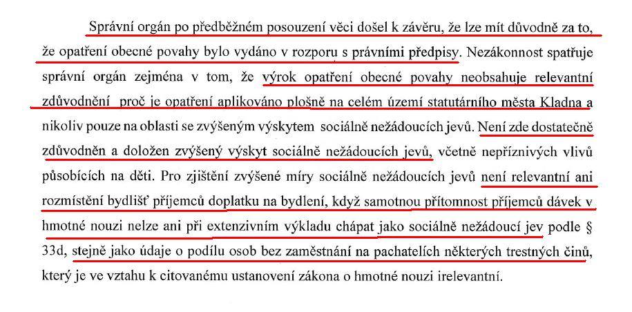 Krajský úřad považuje kladenské opatření za nedostatečně odůvodněné, jak co se týče plošného vymezení na celé Kladno, tak co se týče doložení výskytu sociálně nežádoucích jevů, mezi které Kladno zařadilo i jevy, které za sociálně nežádoucí ani považovat nelze. Ve většině bodů se tak Kraj ztotožnil s naší argumentací. Celé opatření je až neuvěřitelně odbyté a ukazuje na skutečnost, že vedení Kladna nemá žádný zájem problém reálně řešit.